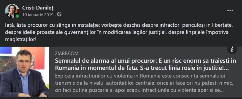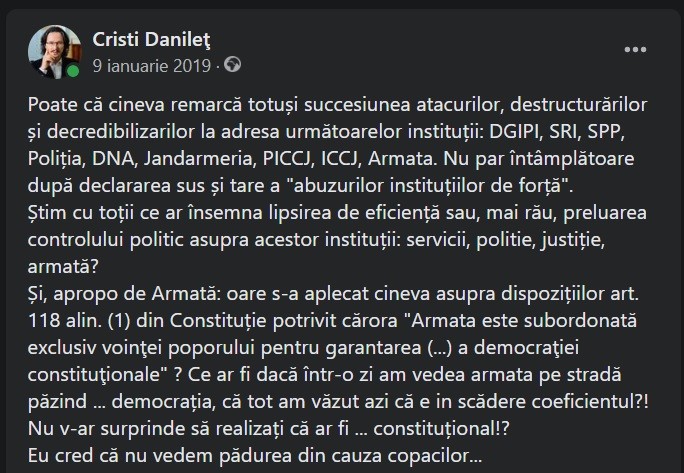 FAPTELE: În ianuarie 2019, am avut două postări pe FB care au atras anchetarea mea: una pe data de 9, făcută în contextul dezbaterilor pe tema numirii șefului de Stat Major, când am atenționat publicul că, după ce politicul a început să controleze poliția, serviciile secrete și justiția, acum vrea să controleze și conducerea Armatei, iar aici trebuie să fim atenți pentru că art. 118 din Constituție permite că armata să fie scoasă pe străzi, chipurile, să păzească democrația; o alta pe data de 10, când am dat un link la articolul de presă cu un interviu al unui procuror care afirma că, în privința modificărilor legilor justiției s-a trecut linia roșie, eu spunând despre acesta că „are sânge în instalație”.